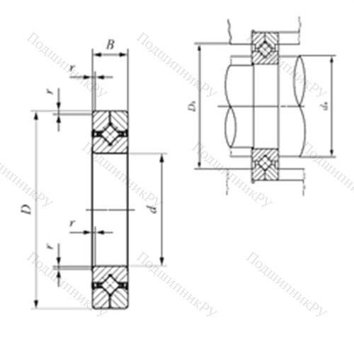 - Обладает более широкой зоной передачи усилий в сравнении с шарикоподшипниковыми аналогами, однако предназначен исключительно для работы с малыми скоростями вращения.
