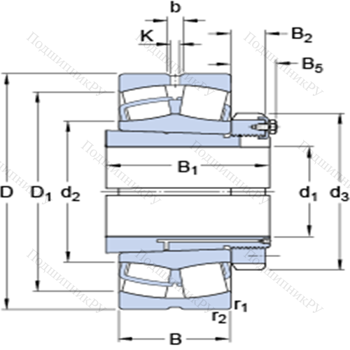 Сферические роликоподшипники на закрепительной втулке 23972 CCK/W33 + OH 3972 H у которого конструкционной особенностью являются ролики в форме конуса и разъемный корпус. Изделие также может быть укомплектовано наружным кольцом с упорным бортиком или большим углом, двухрядными или четырехрядными роликоподшипниками, утолщенной внешней шиной.
